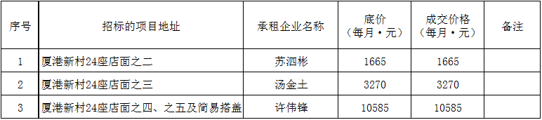 根據(jù)思明區(qū)國有企業(yè)資產(chǎn)出租管理的相關(guān)制度,我司2019年5月28日上午9:00起于觀音山營運中心2號樓2層2號會議室進行公開招租現(xiàn)場開標,現(xiàn)通過思明控股網(wǎng)站對外發(fā)布成交公告,內(nèi)容如下: