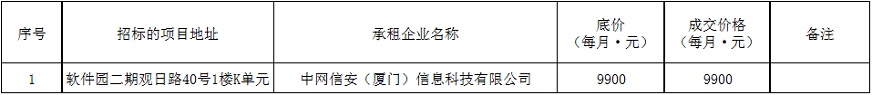 根據(jù)思明區(qū)國有企業(yè)資產(chǎn)出租管理的相關制度,我司2019年6月10日上午9:00起于觀音山營運中心2號樓2層2號會議室進行公開招租現(xiàn)場開標,現(xiàn)通過思明控股網(wǎng)站對外發(fā)布成交公告,內(nèi)容如下: