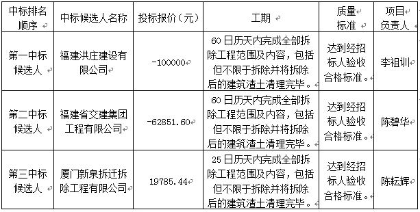 招標編號為廈至信施招[2019]第12號的觀音山C04地塊臨時建筑拆除工程建設(shè)項目,該工程建設(shè)項目施工招標于2019年6月26日依法公開開標后,評標委員會按照招標文件規(guī)定的評標標準和方法進行了評審,根據(jù)評標委員會提交的書面評標報告,現(xiàn)將評標結(jié)果、否決其投標的投標人及否決原因公示如下: