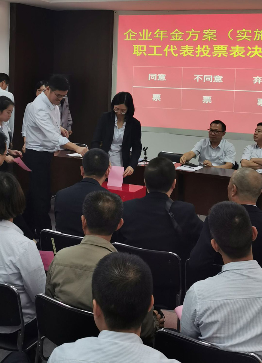 行政部負責(zé)人向大會作了《企業(yè)年金方案》的講解和說明,職工代表分組就《企業(yè)年金方案(實施細則)》進行討論,最后與會職工代表以無記名投票方式表決通過了《企業(yè)年金方案(實施細則)》。