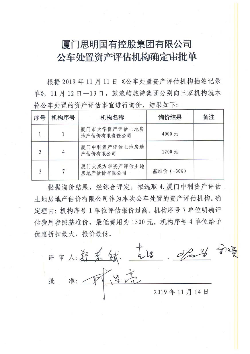 2.《思明控股公車處置(第四批)資產評估機構確定審批單》;