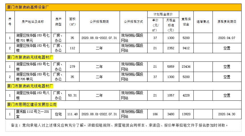 思明區(qū)屬托管企業(yè)擬出租房產(chǎn)招租情況公告