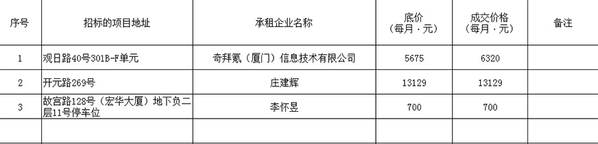 根據(jù)思明區(qū)國有企業(yè)資產(chǎn)出租管理的相關(guān)制度,我司2020年7月3日上午9:00起于觀音山營運(yùn)中心2號樓2層2號會議室進(jìn)行公開招租現(xiàn)場開標(biāo),現(xiàn)通過思明控股網(wǎng)站對外發(fā)布成交公告,內(nèi)容如下: