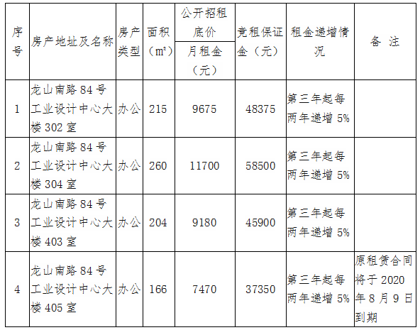 根據(jù)國(guó)有企業(yè)資產(chǎn)出租管理相關(guān)制度,我司決定對(duì)位于思明區(qū)龍山南路84號(hào)工業(yè)設(shè)計(jì)中心3至4層房產(chǎn)對(duì)符合入駐條件的意向承租人進(jìn)行公開(kāi)競(jìng)價(jià)招租,具體信息如下: