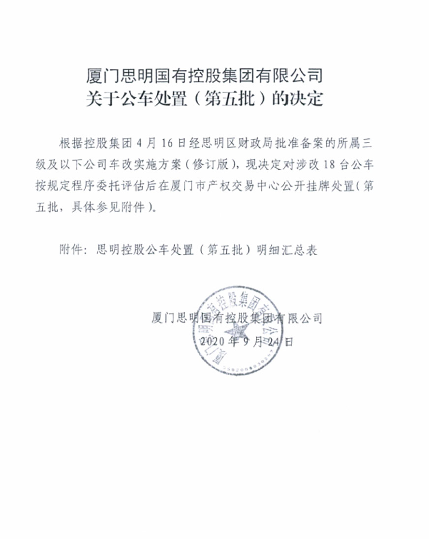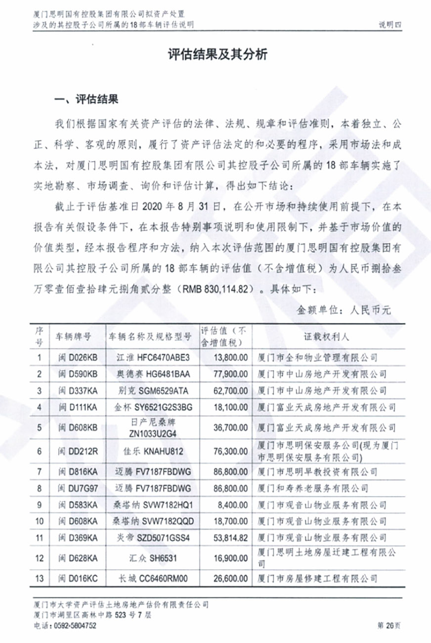 根據(jù)2020年6月5日我司報經(jīng)思明區(qū)財政局批準備案的《關于報送所屬三級及以下公司車改實施方案事宜的情況說明》相關文件精神,我司委托廈門市大學資產(chǎn)評估土地房地產(chǎn)估價有限責任公司對公車處置(第五批)的車輛進行評估,該公司已于9月30日向我司提交資產(chǎn)評估結果初稿?,F(xiàn)將評估結果進行公示,如有異議,歡迎來電來函反映。