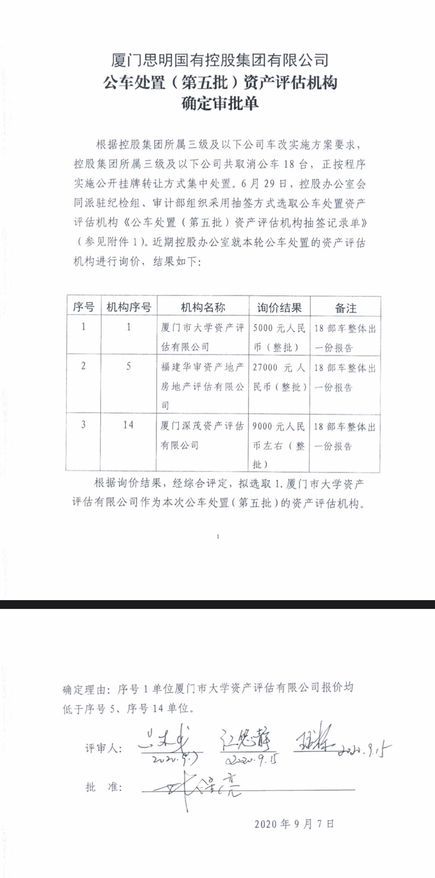 附件:1.《公車處置(第五批)資產(chǎn)評估機構確定審批單》