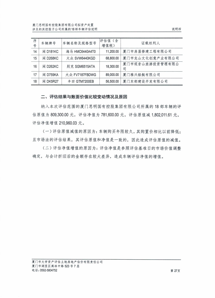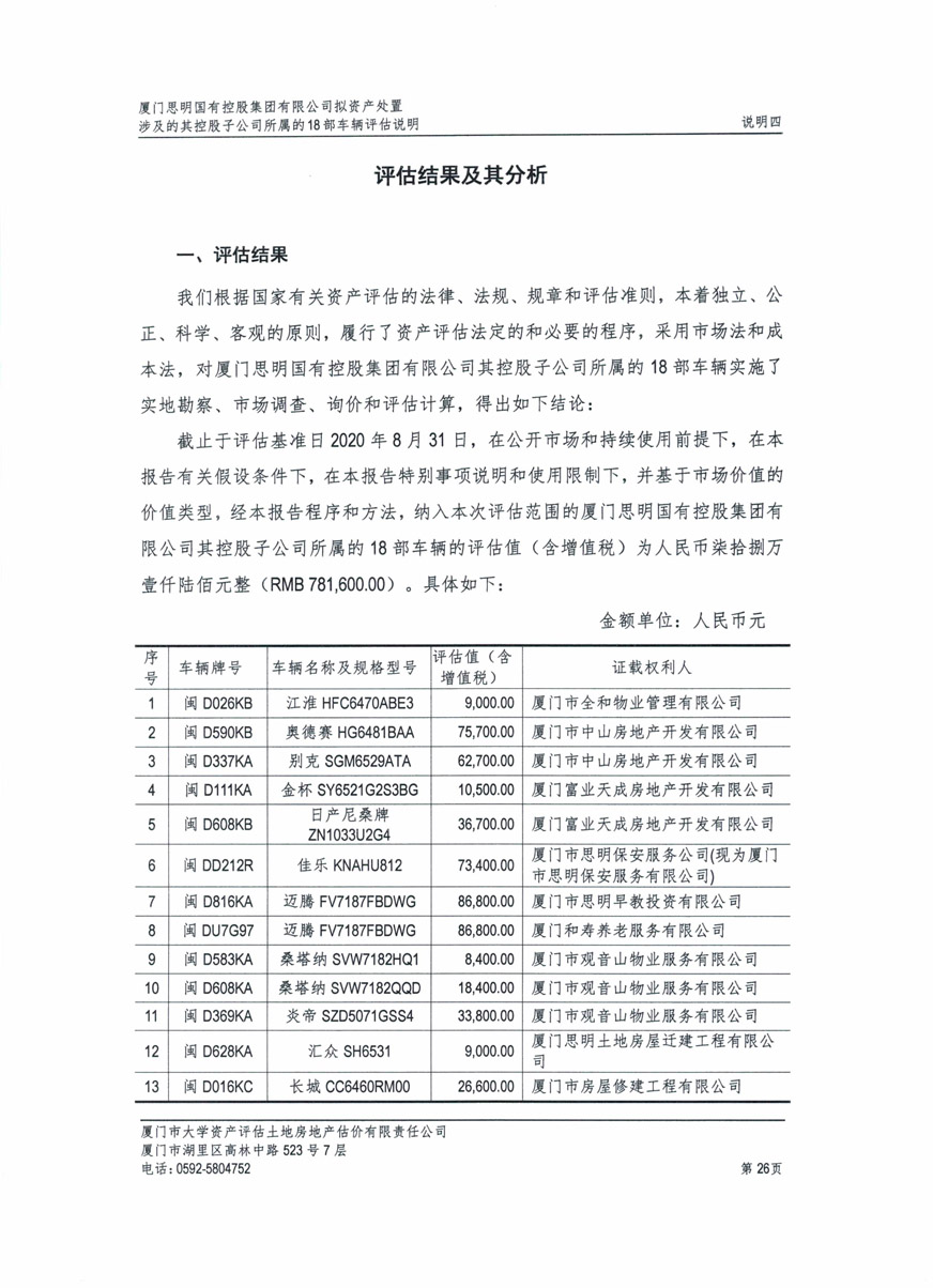 根據(jù)2020年6月5日我司報經(jīng)思明區(qū)財政局批準備案的《關于報送所屬三級及以下公司車改實施方案事宜的情況說明》相關文件精神,我司委托廈門市大學資產(chǎn)評估土地房地產(chǎn)估價有限責任公司對公車處置(第五批)的車輛進行評估,該公司已于11月10日向我司提交資產(chǎn)評估結果?,F(xiàn)將評估結果進行公示,如有異議,歡迎來電來函反映。