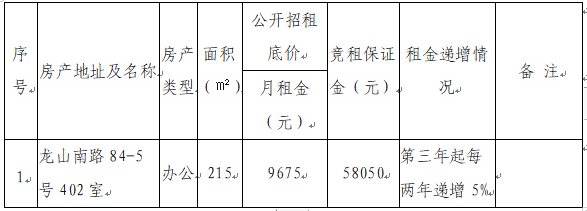 根據(jù)國有企業(yè)資產出租管理相關制度,我司決定對位于龍山南路84-5號402室房產對符合入駐條件的意向承租人進行公開競價招租,具體信息如下: