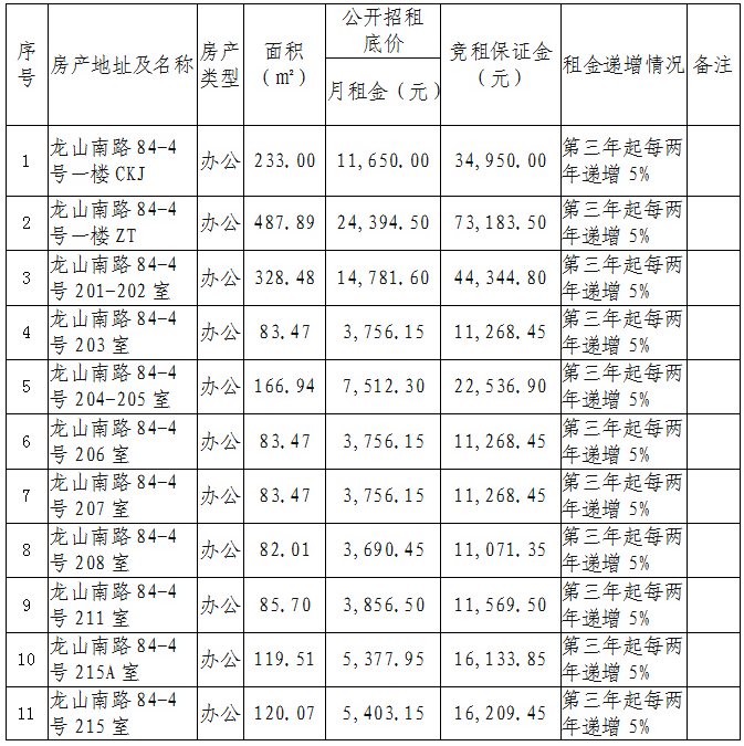 根據(jù)國有企業(yè)資產(chǎn)出租管理相關(guān)制度,我司決定對位于思明區(qū)龍山南路84-4號(hào)樓部分面積房產(chǎn)對符合入駐條件的意向承租人進(jìn)行公開競價(jià)招租,具體信息如下: