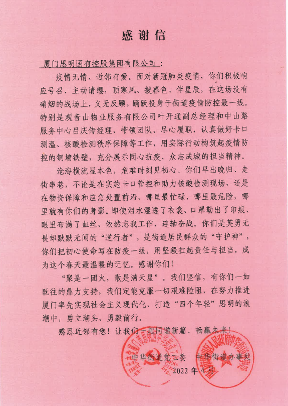 4月20日下午,中華街道黨工委副書記、街道辦主任王雪梅率街道四級調(diào)研員嚴開松、黨政辦負責(zé)人蘇江圳一行給思明控股觀音山物業(yè)所屬中山路服務(wù)中心送上錦旗和慰問信,感謝思明控股集團觀音山物業(yè)中山路服務(wù)中心團隊全力配合協(xié)助街道疫情防控工作,對團隊致以崇高的敬意和衷心的感謝。