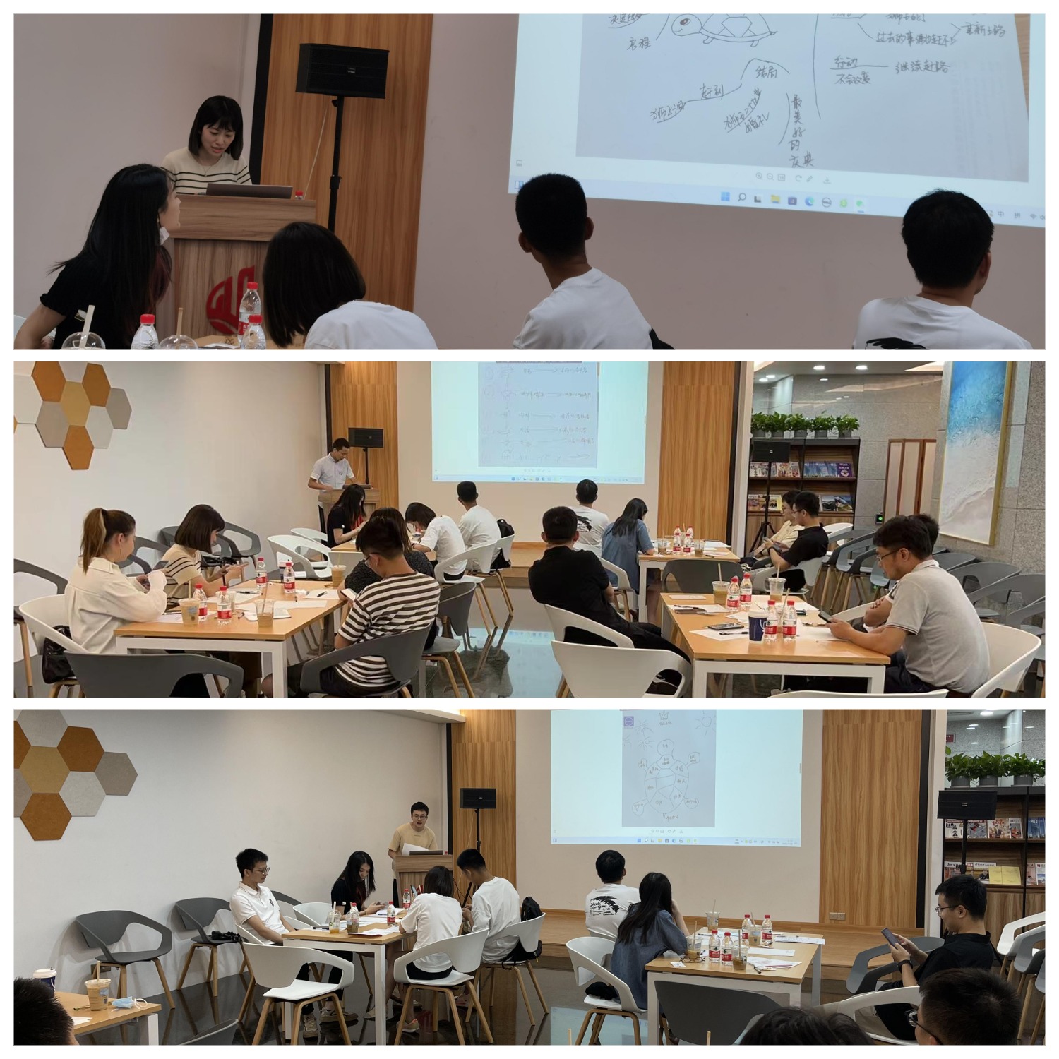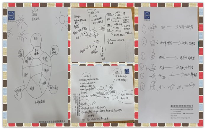 在閱讀繪本《犟龜》后,讀書(shū)沙龍會(huì)進(jìn)入第二個(gè)環(huán)節(jié)“多動(dòng)筆”,通過(guò)梳理故事情節(jié)、組內(nèi)分享,繪制思維導(dǎo)圖,記錄各自的感悟,引導(dǎo)小伙伴們形成多思善記的習(xí)慣。