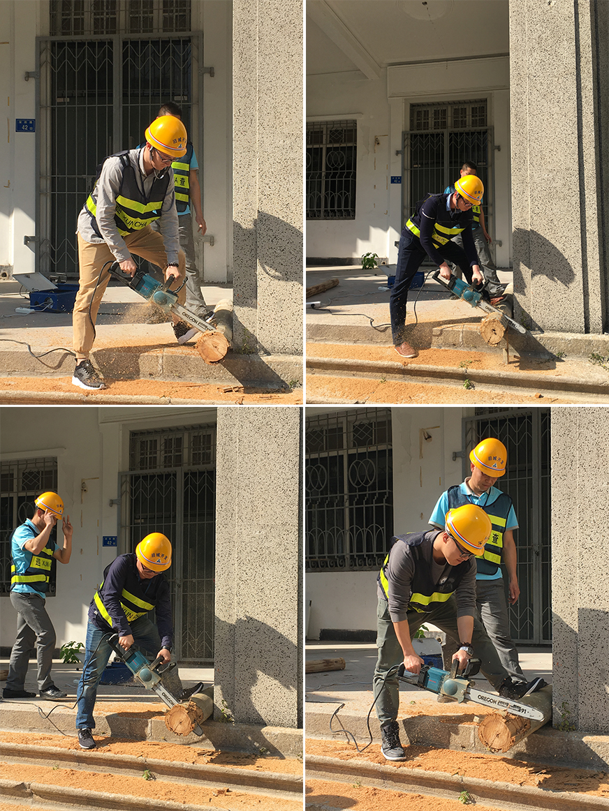 在應急搶險器材中電鋸的操作演練環(huán)節(jié),隊員們整齊有序,一個接一個,沒有過關(guān)主動再操作一次,一轉(zhuǎn)眼功夫,一塊大長條的原木被隊員們像切白蘿卜般輕輕松松一塊塊分身落地,場地響起雷鳴般的掌聲。